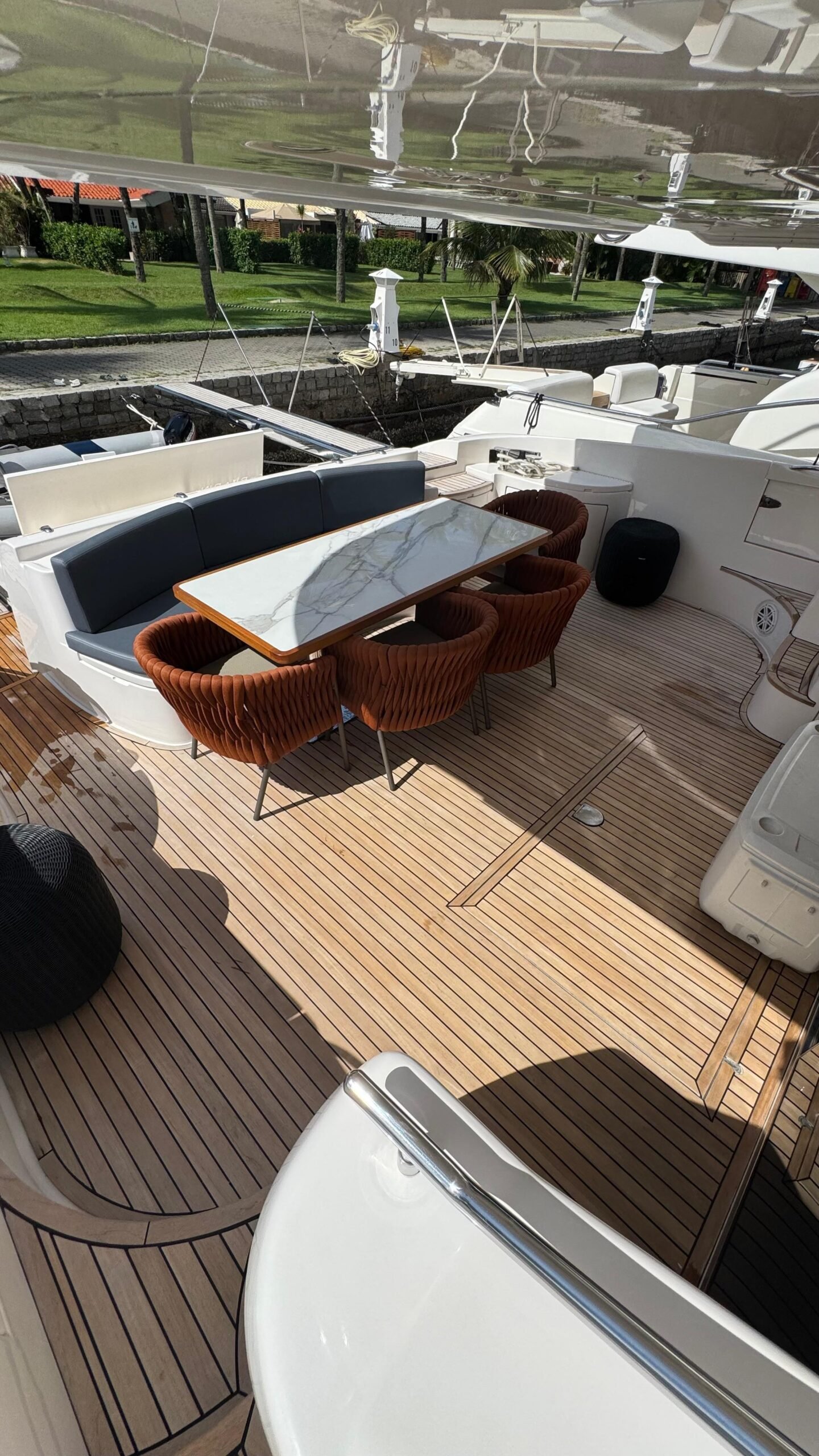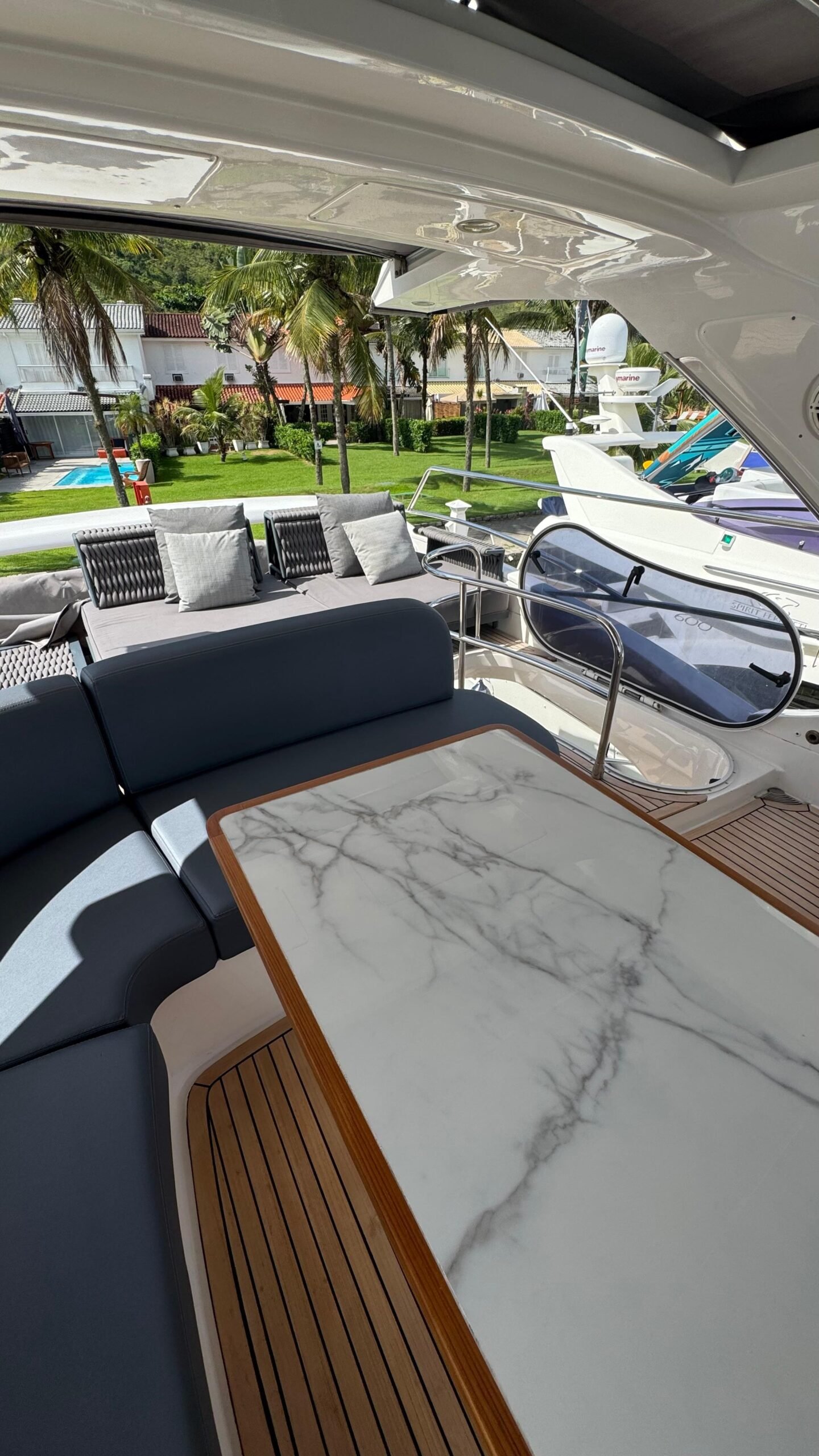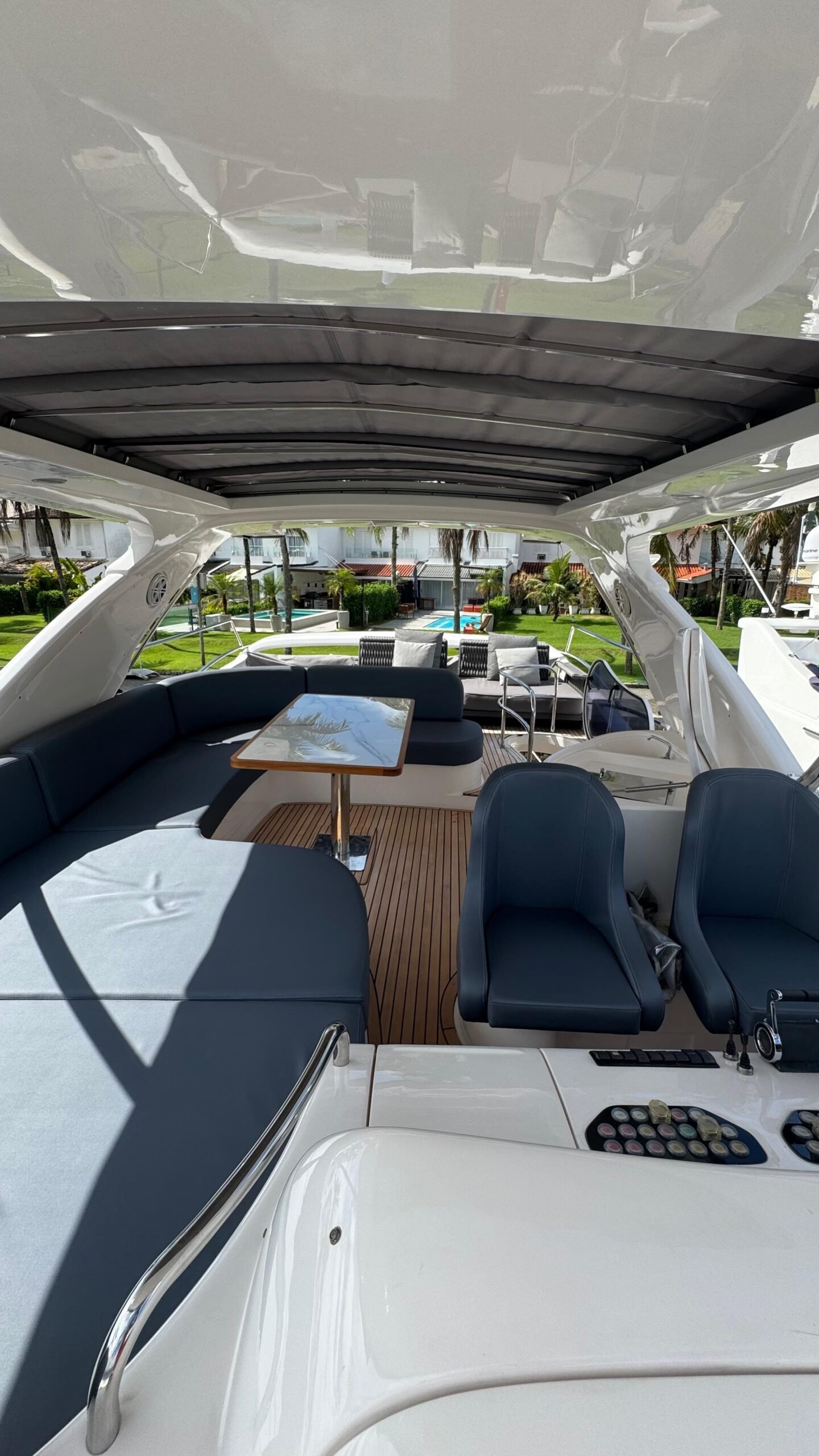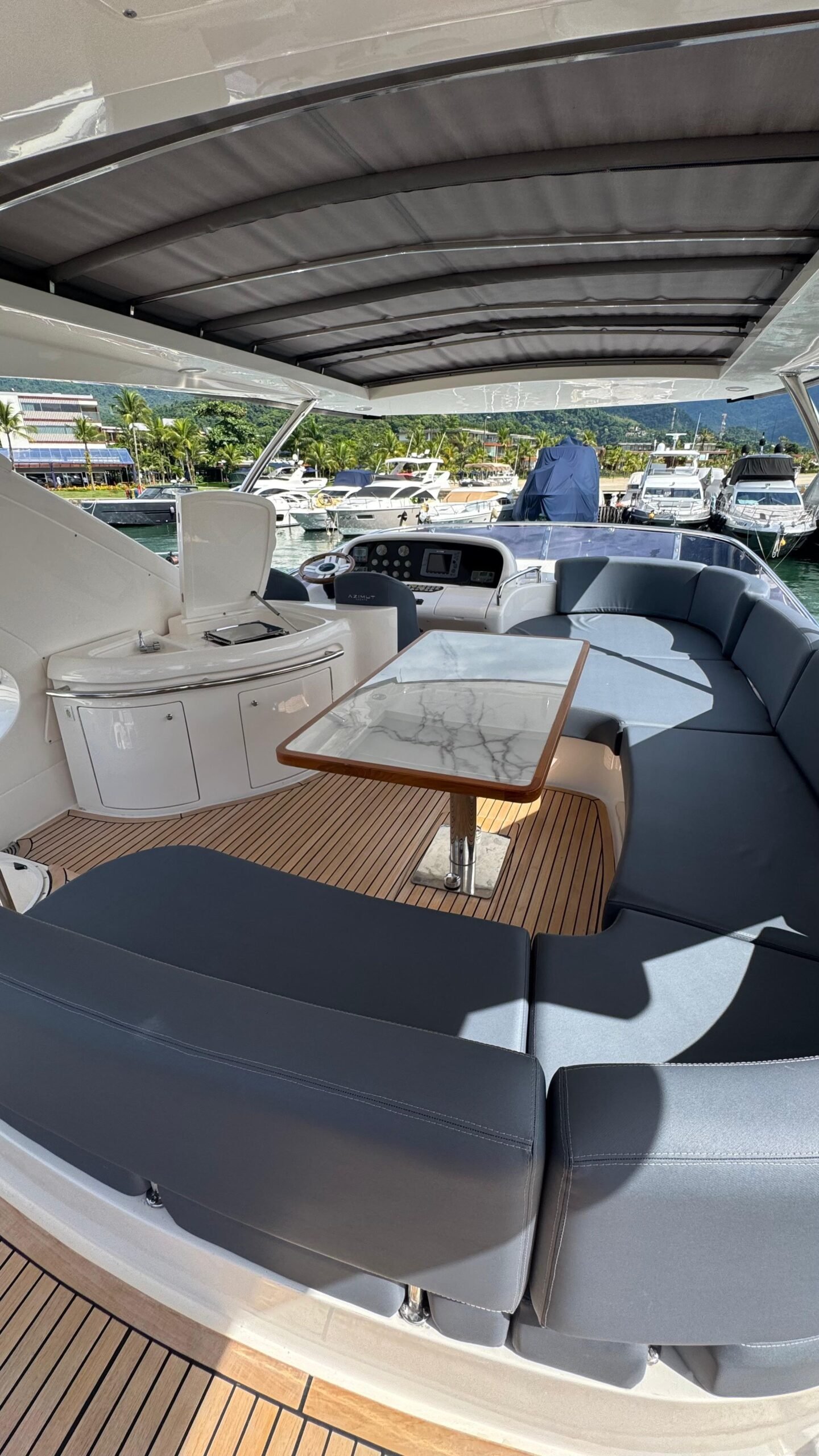 Flybridge gigante com solário, mesa, sofás e área gourmet