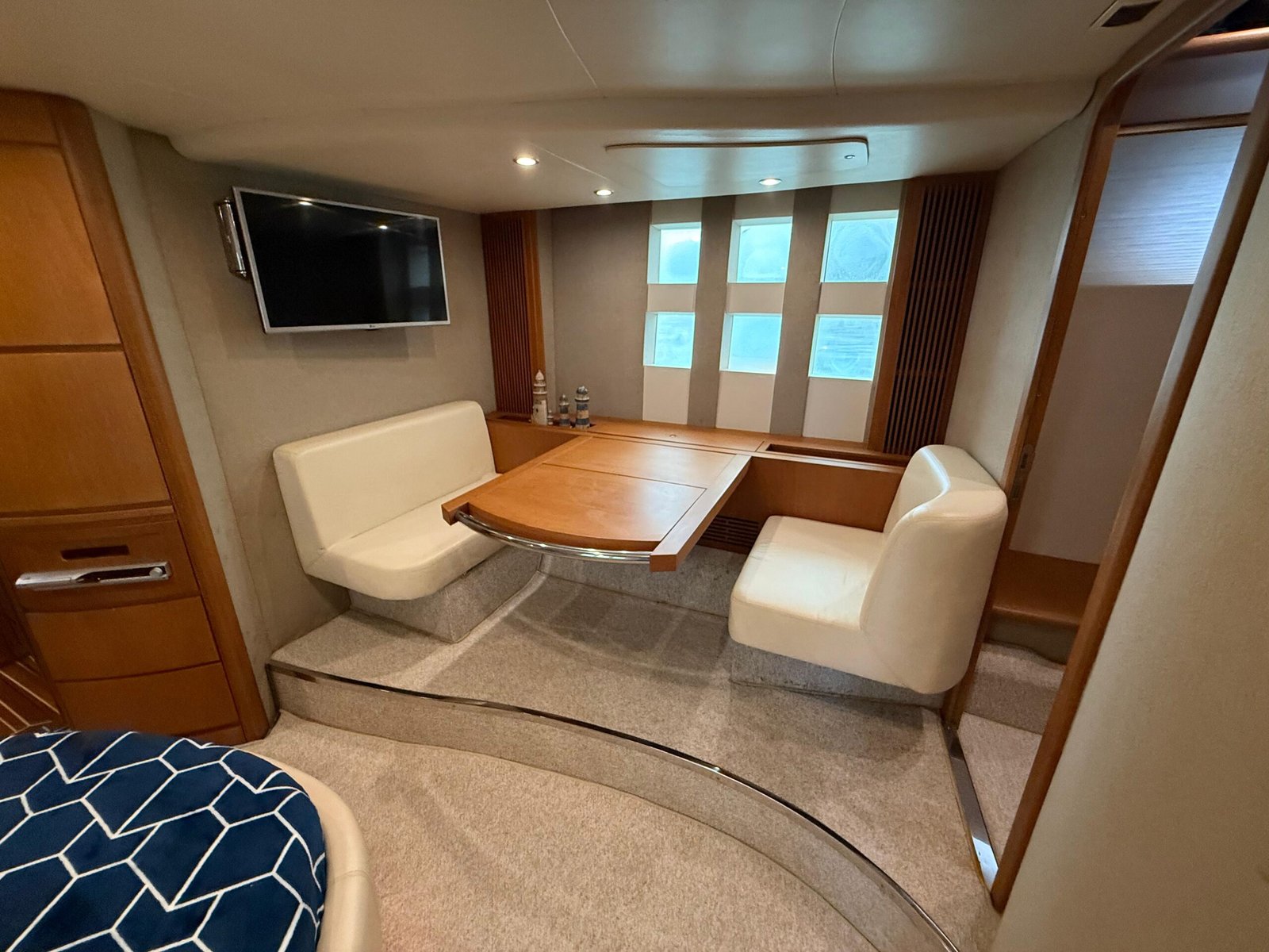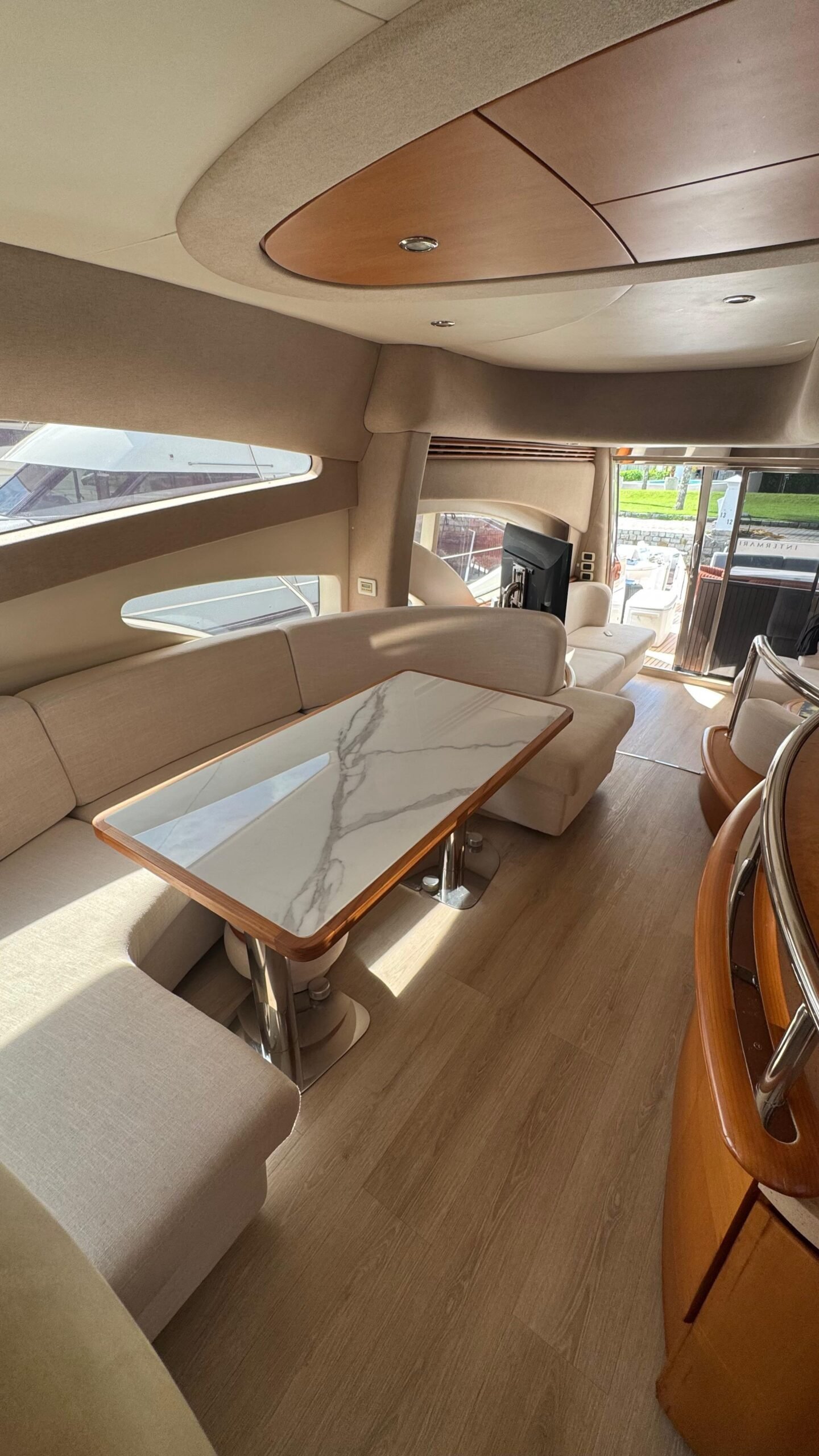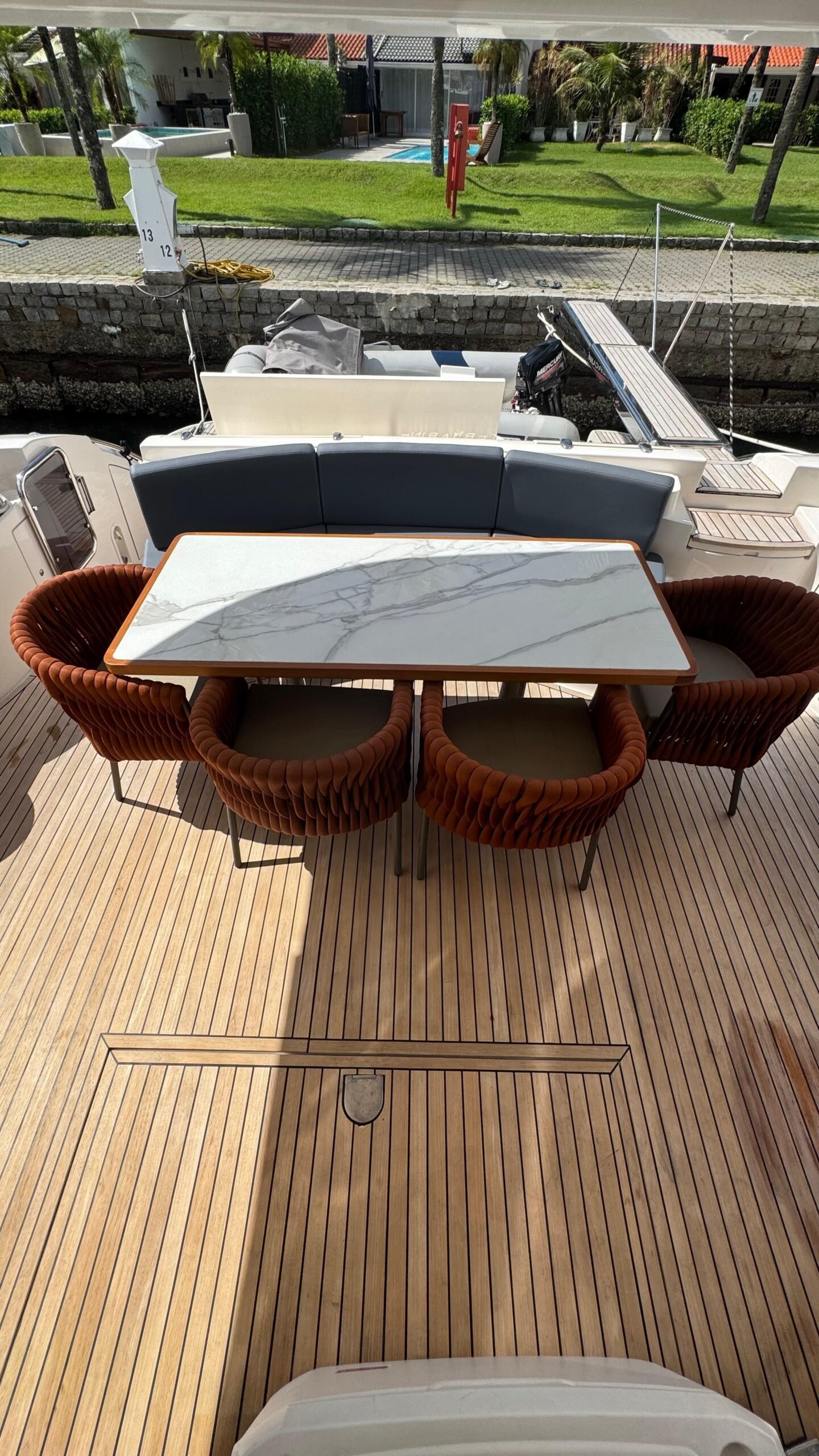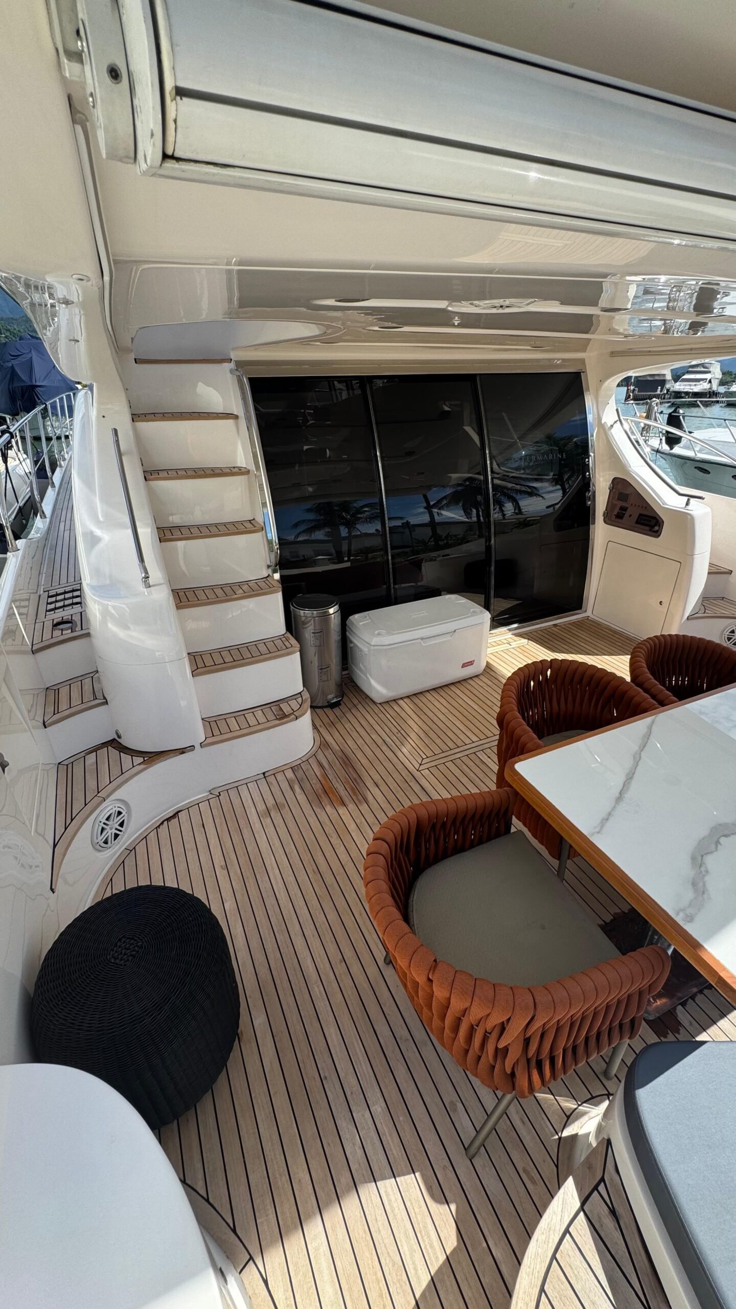 Flybridge gigante com solário, mesa, sofás e área gourmet